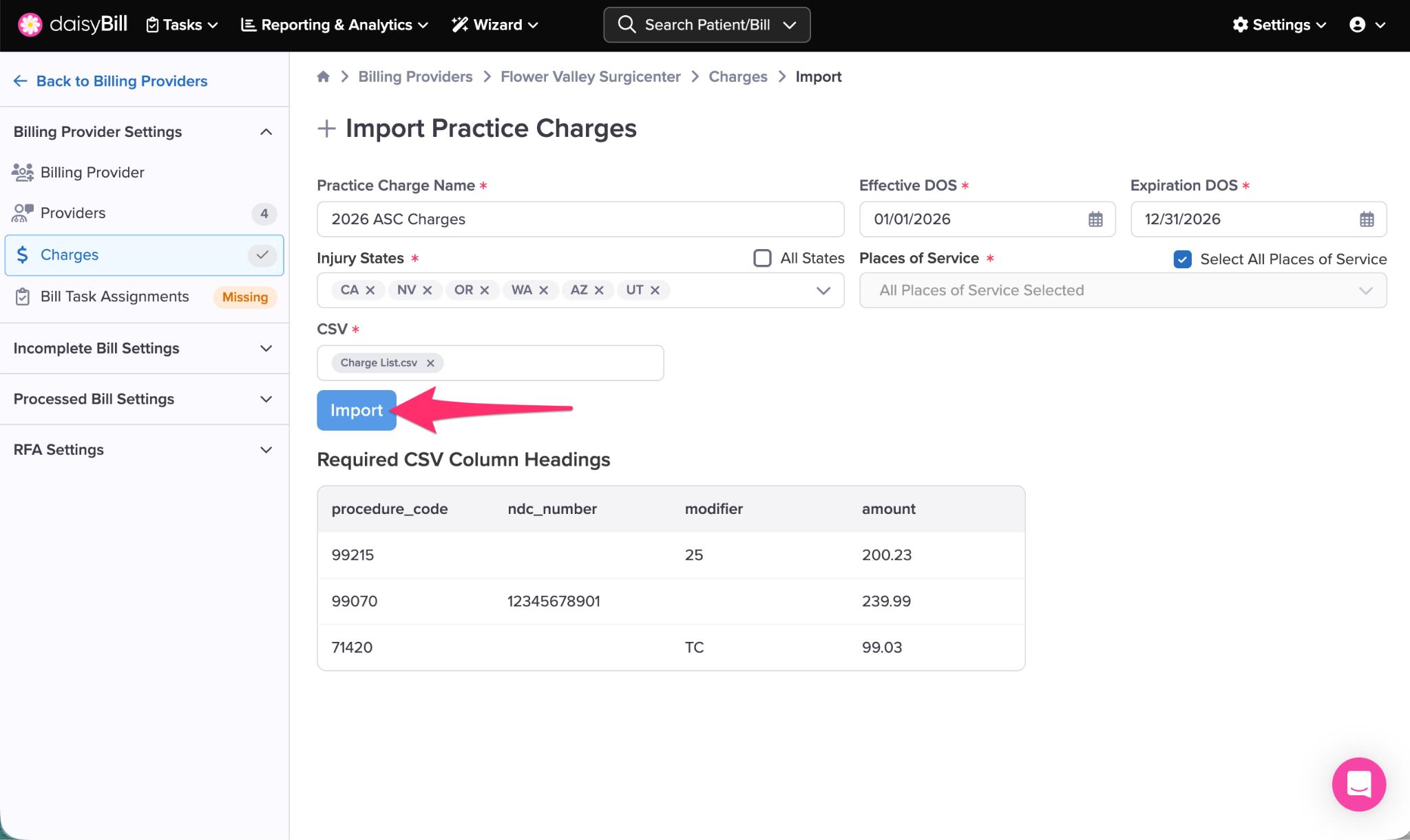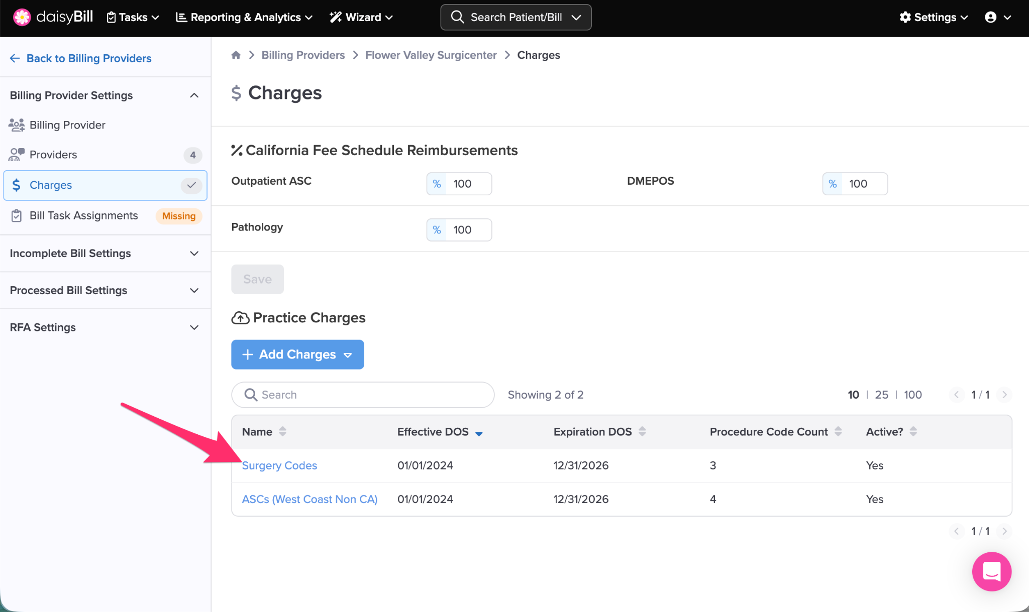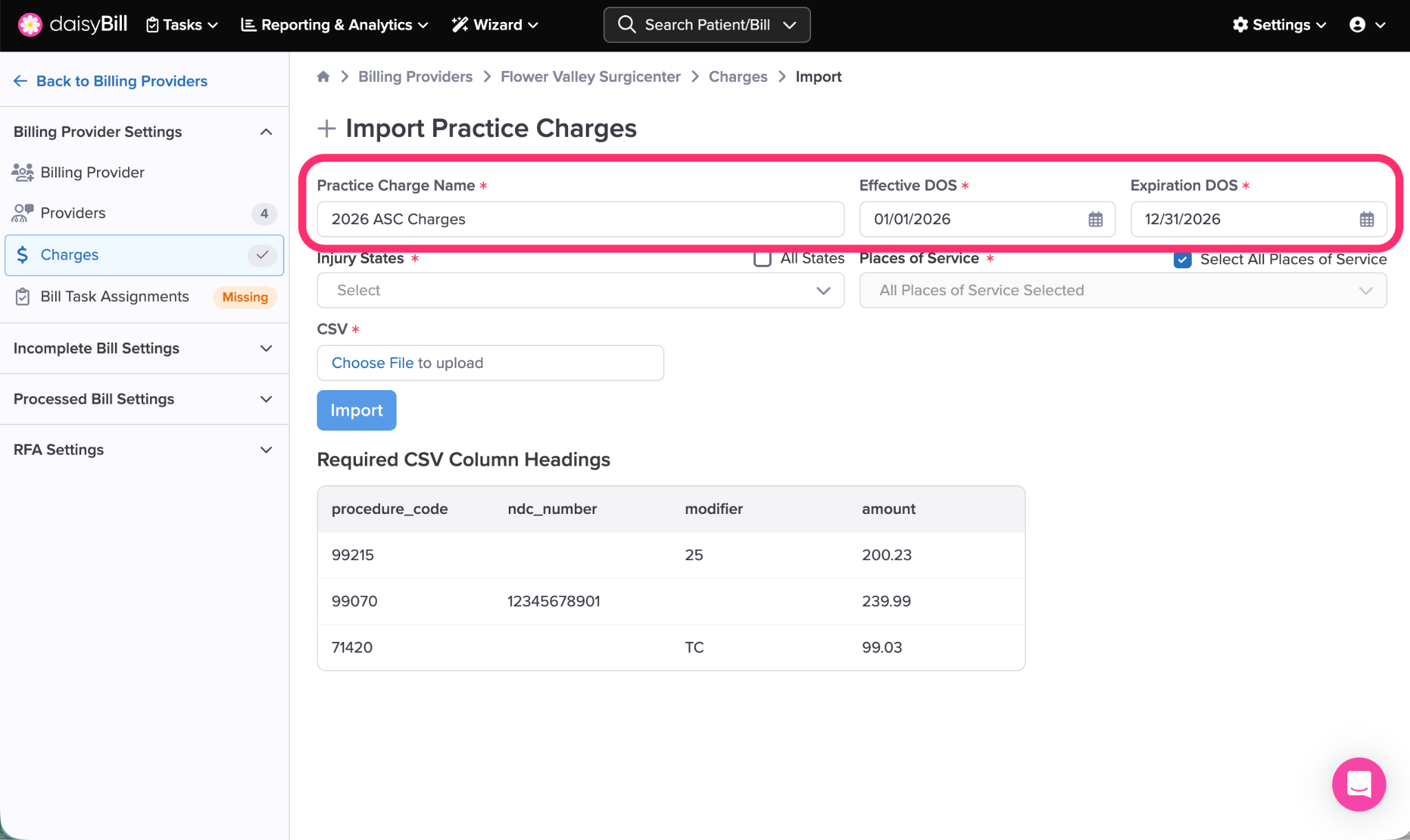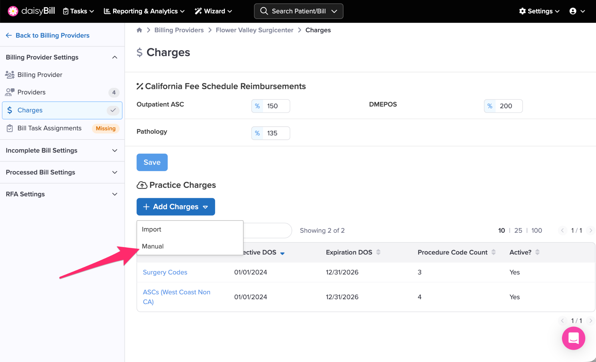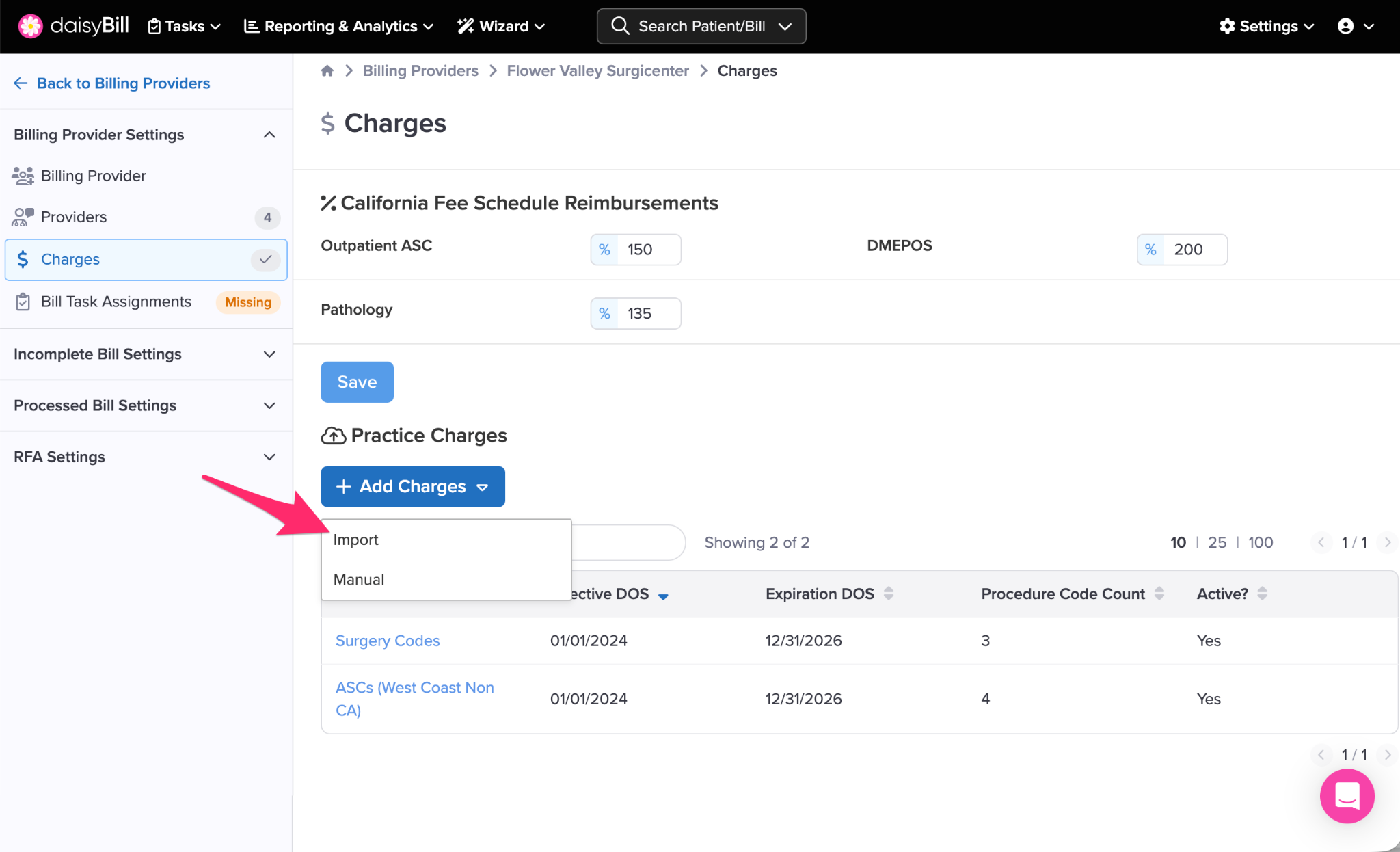 If you don’t see this option, it’s because daisyBill is still working on your state’s fee schedule! Follow the steps below to import or create your own Practice Charges.