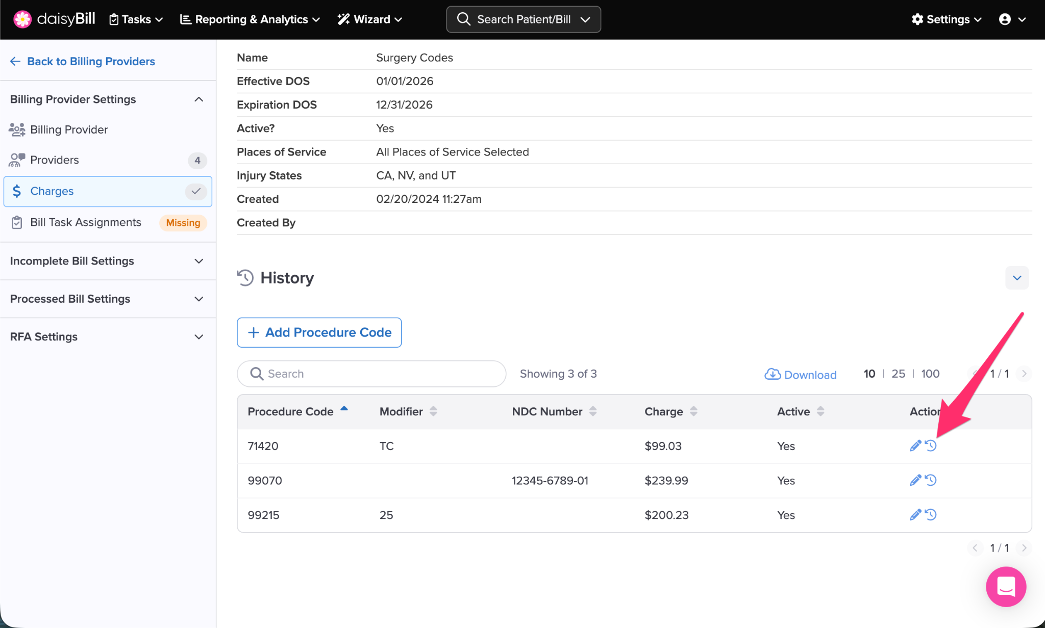 Step 18. To edit a ‘Procedure Code’, click the ‘Pencil’ icon