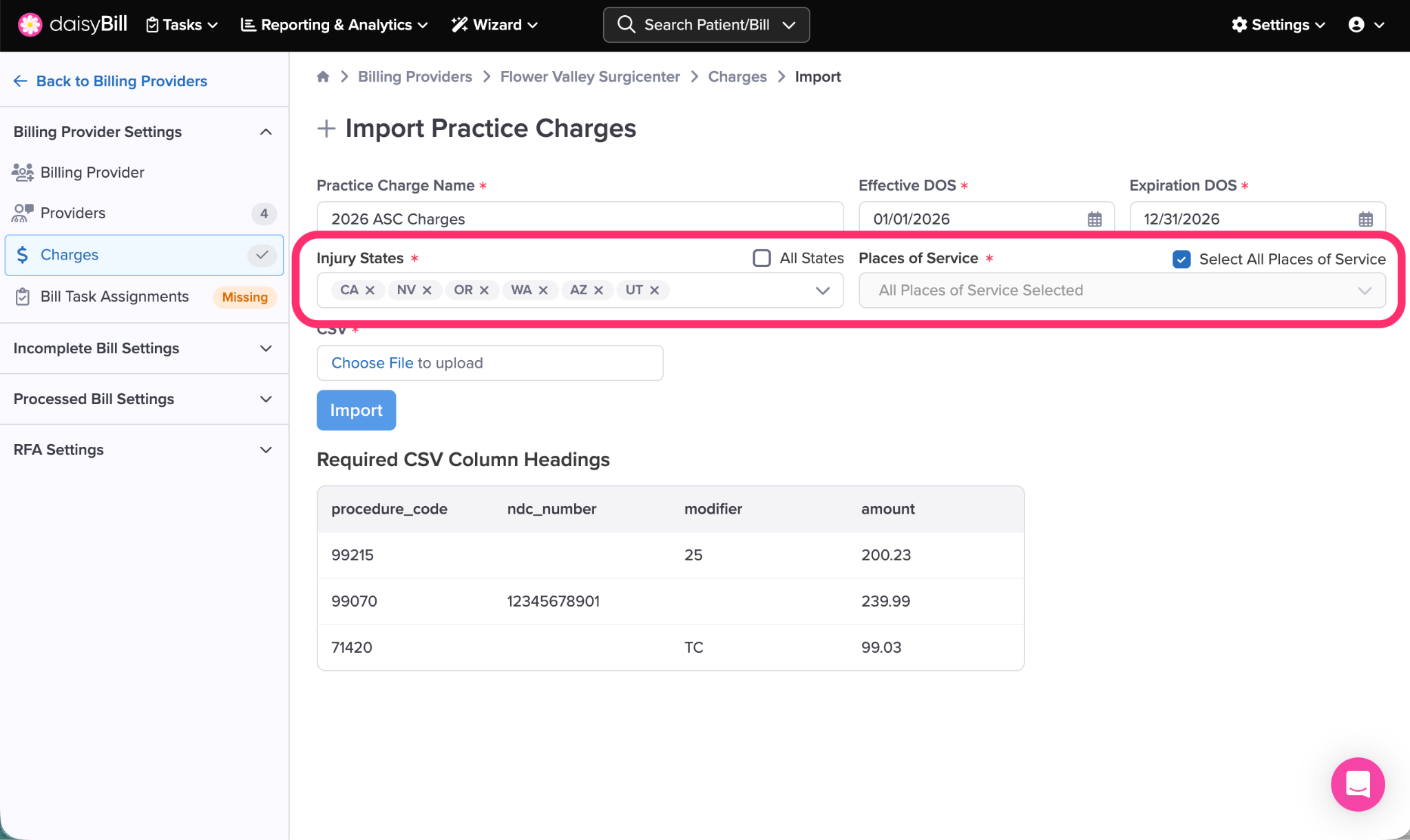 Step 6. Select the Injury States and Places of Service the charges will apply to