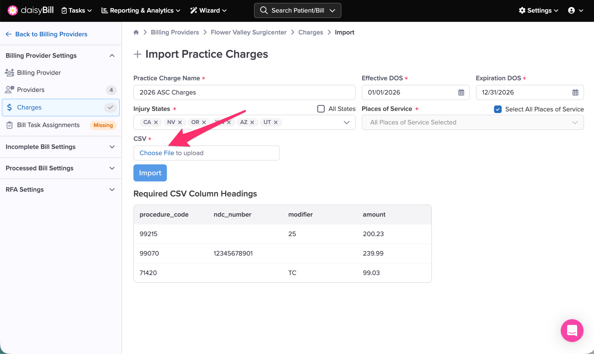 Note: The CSV file MUST use the column headings ‘procedure_code’, ‘supplemental_data’, ‘modifier’, and ‘amount’.