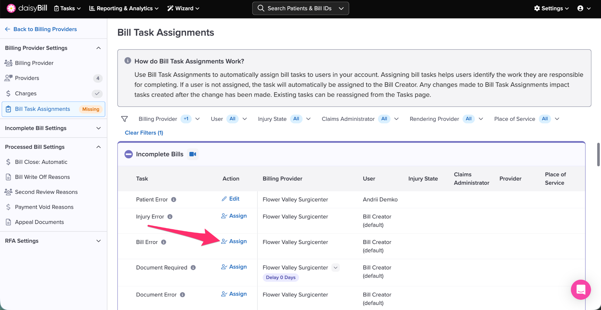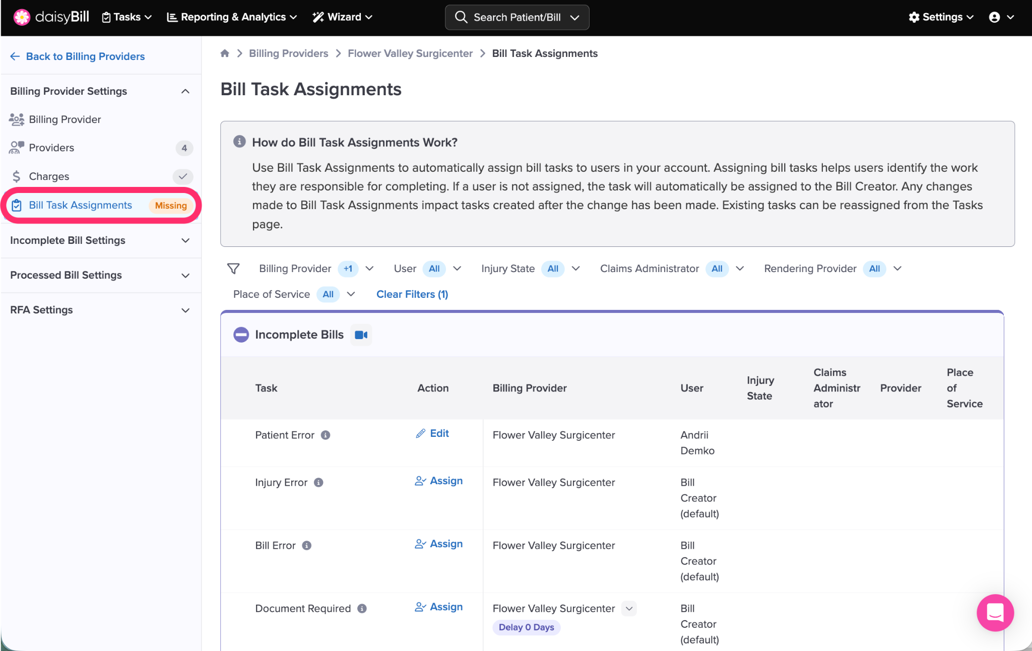The default state for all tasks is ‘Bill Creator’. Tasks can be assigned based on a Specific User, the Patient’s Last Name, an Injury State, a Claims Administrator, or an Operating Provider.